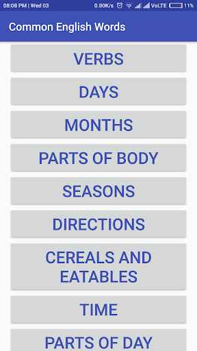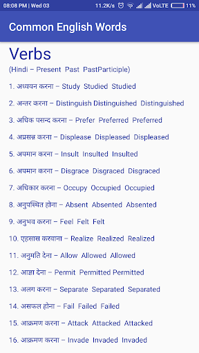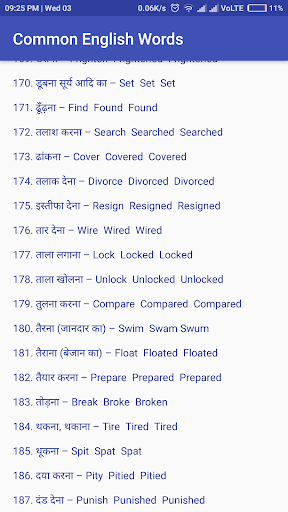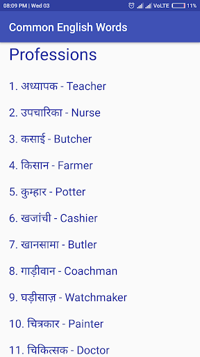 This app contains more than thousand English words which are used in daily life. This app is excellent for those people who want to learn English. People can also revise these English words regularly. This app contains most common Hindi to English words. Every word has been presented systematically. More words will be added to every update. English words have been presented with their meaning in Hindi.