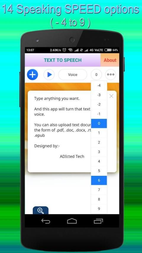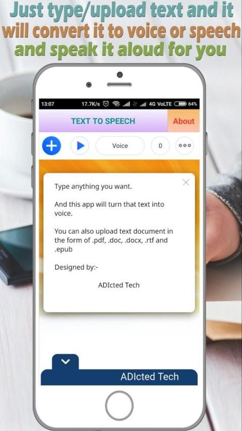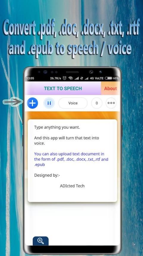 ✨This app is specially designed and customized to be simple so that it is very easily operational. This app lets you convert any text you type to speak as voice. You can also convert .pdf, .doc, .docx, .txt, .rtf and .epub to speech / voice and speaks it for you in 58 different types of voices in 9 languages i.e. English (US, UK), Spanish (Spain, Mexico, Castilian, US), French (France , Canada), German, Italian, Portuguese (Brazil, Portugal), Swedish, Dutch.