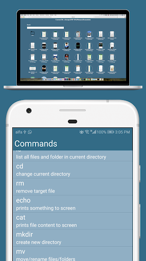Basic linux-like commands are available (cd, ls rm, mv, cp, touch, find, echo, mkdir, >>, >)