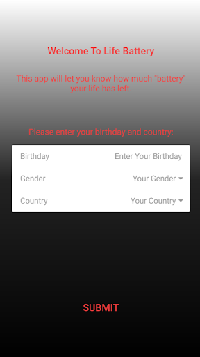 Life Battery provides an easy-to-understand visual representation of your lifespan by basing it off a battery. Simply enter your birthday, gender, and country, and Life Battery will take care of the rest.