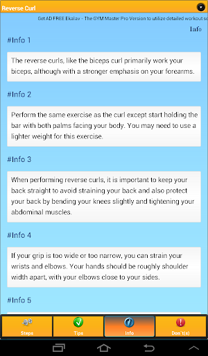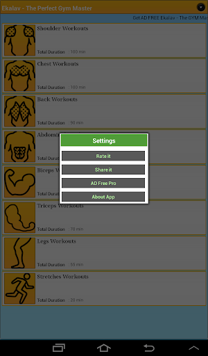 Get the ad free version of this app, https://play.google.com/store/apps/details?id=com.truedreams.ekalavgymmasterpro&hl=en