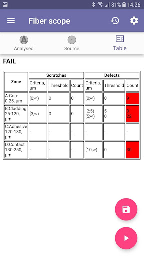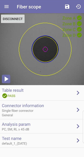 แอพที่ออกแบบมาเพื่อทำงานกับความหลากหลายของ Veex Fiberscopes (DI-3000, DI-1000, DI-1000MPO)ดูตัวเชื่อมต่อปลายหน้าสำหรับการปนเปื้อนรอยบุบและ / หรือรอยขีดข่วนการวิเคราะห์ผ่าน / ล้มเหลวตามมาตรฐาน IEC-61300-3-35บันทึกรูปภาพในรูปแบบไฟล์. jpg