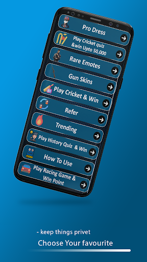 We share 100% free skins. Lots of app task like FFF Skin, Guns machine and sharing, invite friends.