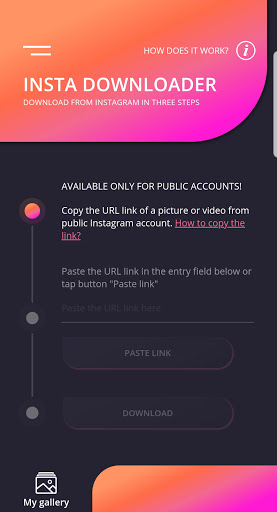 - แอพพลิเคชั่นให้ ความสามารถในการดาวน์โหลดภาพยนตร์และภาพถ่ายจาก Instagram ฟรีไฟล์ทั้งหมดจะถูกบันทึกลงในแกลเลอรี่ของอุปกรณ์