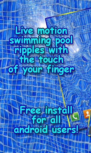 Enjoy the scenic view of the swimming pool with ripple live motion effect as a background and blend in as a wallpaper free****Swimming Pool on a Phone LWP comes with interactive effects, you can control in your settings option!****This is simply the very best Swimming Pool on a Phone LWP you will ever install for FREE onto your android phone.Save this wallpaper, background and image right onto your phone as a screen saver by retrieving from your "SETTINGS" tab(go to live wallpapers)--SIMPLE AS THAT!!Simply put, you will be insanely impressed with the motion wallpapers of actual authentic Live motion swimming pool effects that has ever been displayed on google Play.Are you ready to take a dive and install this app today.Use this awesome live swimming pool application as a meditation option or just something to give you tranquility throughout the day.You control the size and speed of the authentic swimming pool ripples.You can save this live motion wallpaper and set as a background image so that you will never get bored of a "still" image again.We have several featured settings for you to enjoy as well.Place your finger on the screen and move the Swimming Pool on a Phone LWP into any direction you prefer. Use your finger to touch the swimming pool and create these cool live motion ripple effects.Setting options include:SWIMMING POOL RIPPLE SIZEFREQUENCY OF SWIMMING POOL RIPPLE WAVESENABLE TOUCH TOGGLEENABLE RANDOM SWIMMING POOL WAVESCHOOSE THE SPEED OF THE SWIMMING POOL RIPPLESYou need to install this right now to enjoy this very accurate looking Swimming Pool on a Phone LWPWe hope you enjoy this wonderful high quality Swimming Pool on a Phone LWP application as much as we did making it for you!Please don't hesitate to notify us if you have any questions. Please save this application onto your phone as we will be upgrading this application on a monthly basis.We ask that after playing with this application that you leave a positive review so that other users can benefit from your comments and enjoy this very top quality Swimming Pool on a Phone LWP application.This is ad supported so we can pay our billsWe want to keep the app completely free, In order to keep free is ad supported and may contain ads in the notification tray and or home screen. This will help keep it free and help us bring you more cool apps like this in the future.You can optout notification ads from:Airpush Optout: http://www.airpush.com/optoutSendDroid Optout: http://senddroid.com/opt-out/every mobile landing page that the user is directed to has an "unsubscribe" link at the bottom, which opts-out a user with a single click.