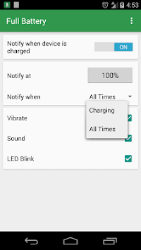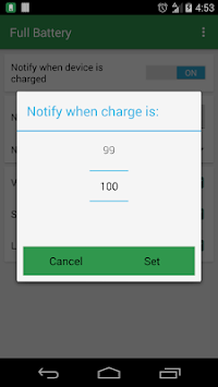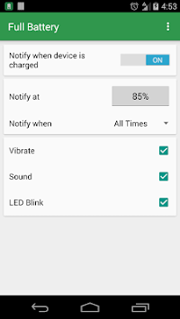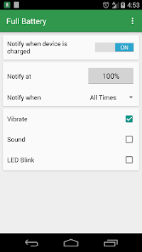 Additionally, Full Battery provides you with great flexibility, allowing you to tell the app to notify you at any battery charge you want!
