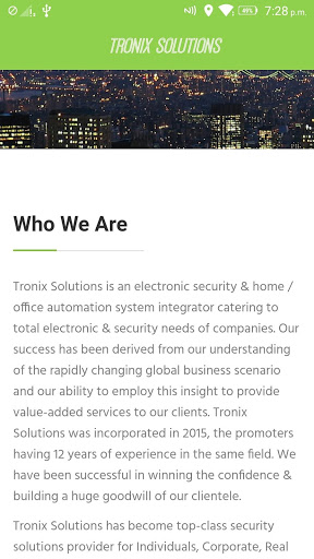Tronix Solutions is an electronic security & home / office automation system integrator catering to total electronic & security needs of companies. Our success has been derived from our understanding of the rapidly changing global business scenario and our ability to employ this insight to provide value-added services to our clients. Tronix Solutions was incorporated in 2015, the promoters having 12 years of experience in the same field. We have been successful in winning the confidence & building a huge goodwill of our clientele.