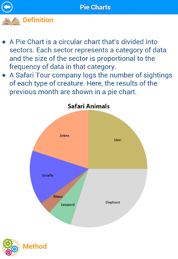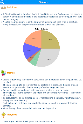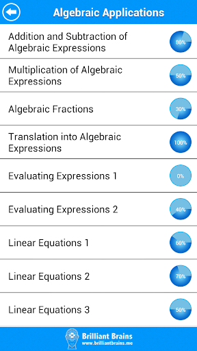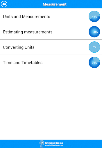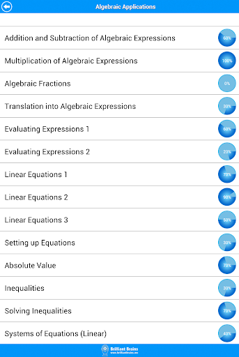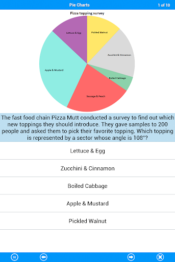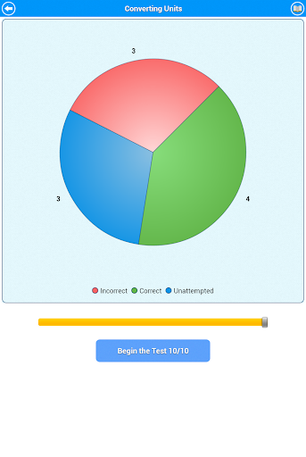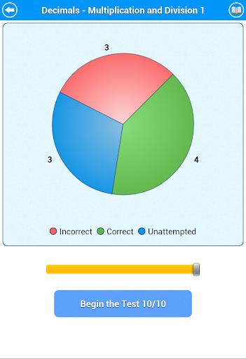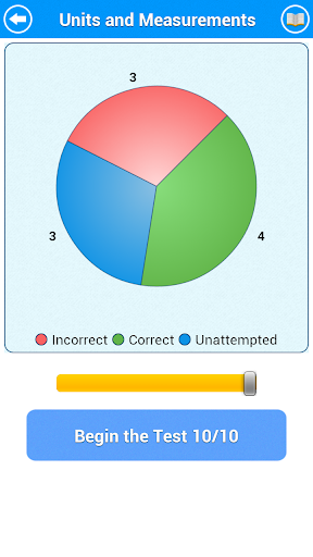 An interactive pie chart displays current progress for each topic. You can touch the different color slices of the pie and choose if you wish to answer only incorrectly answered questions, unattempted or correctly answered questions. This feature is very useful to achieve 100% score in each topic.
