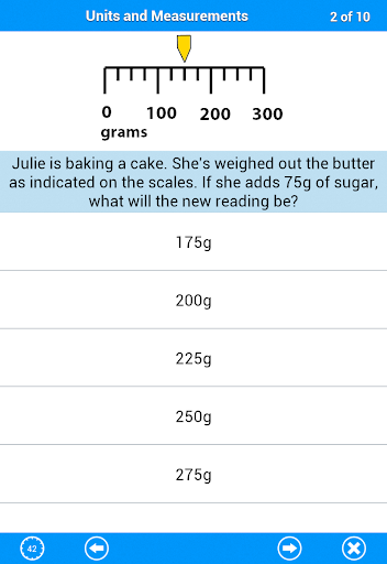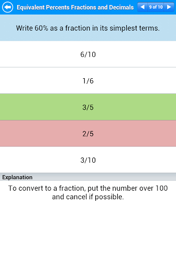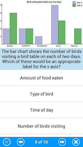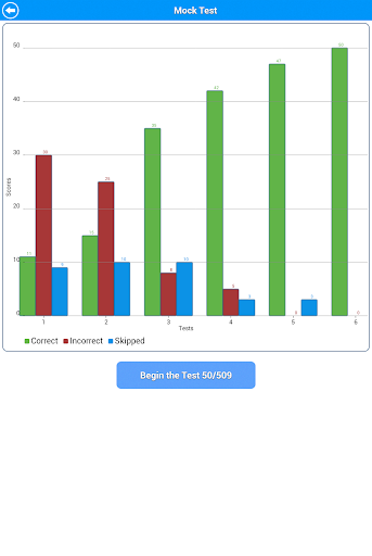 After you have practiced all types of questions, you can take a Mock Test with 50 questions. The Mock Test has questions selected randomly from each topic. Scores for the mock tests taken in the past are displayed in a bar chart. This is a great way to track how you are progressing in mock tests. There is no limit on how many mock tests you can take.