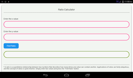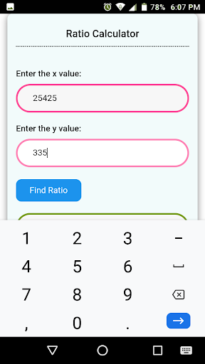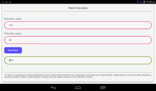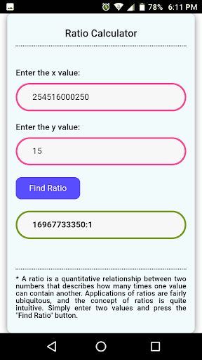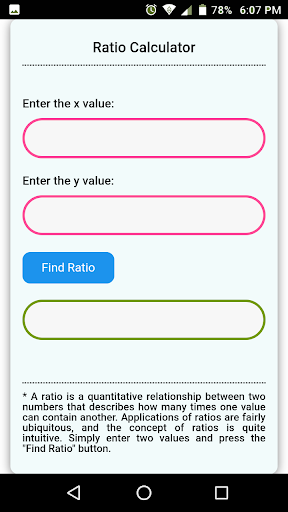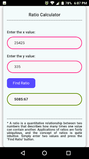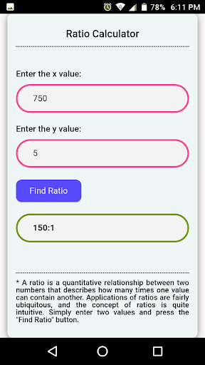 แอพนี้ช่วยให้คุณค้นหาอัตราส่วนภายในไม่กี่วินาที เพียงป้อนค่าสองค่าแล้วกดปุ่ม "ค้นหาอัตราส่วน"