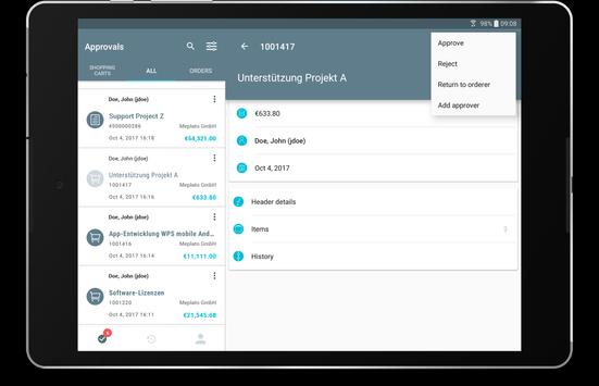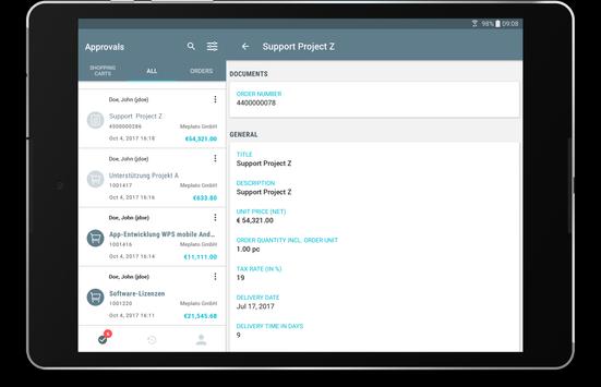 WPS mobile enables you to approve your shopping carts and order changes from anywhere in the world. Receive push notifications for any new approval, see the details of the object on header and position level.