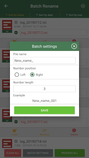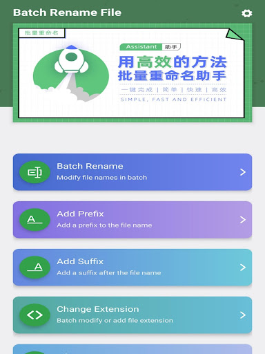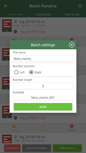Batch Rename File is a small tool APP that can modify file names in batches. This APP can meet all your needs for file renaming, freeing you from boring, repetitive, and time-consuming mechanical actions. Say goodbye to rename file name one by one. Rename the file, in batch mode, at least 80% of your time will be saved! And the functions are rich, the functions include: batch renaming files, batch adding prefixes to file names, batch adding suffixes to file names, batch changing file extensions,batch add serial number, batch add last modify time, batch add file size, batch replace characters, batch conversion file name case, etc., can sort files that need to be renamed, support sort by file name, file size, file last modification time, and custom drag-and-drop sorting, etc. All operations are completed by one click, which is simple and fast. ^_^
