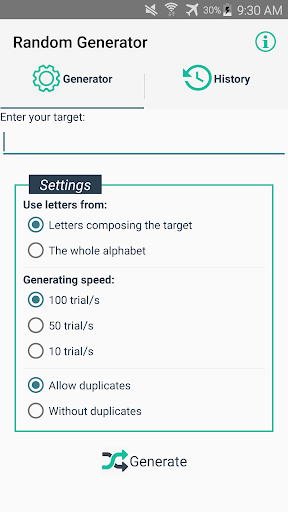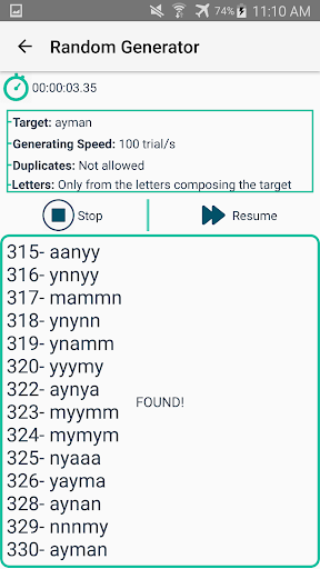 Witness our app randomly composing your target by generating letters and checking each time if it matches your target.