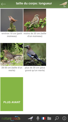 2. คุณป้อนคุณสมบัตินกเช่นขนาดขนนกหรือที่อยู่อาศัยที่มีเพียงไม่กี่คลิก จากนั้นชื่อของนกจะปรากฏขึ้น คุณจะได้รับข้อมูลรายละเอียดเกี่ยวกับสัตว์ที่นี่ ไม่จำเป็นต้องเชื่อมต่ออินเทอร์เน็ต