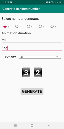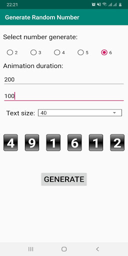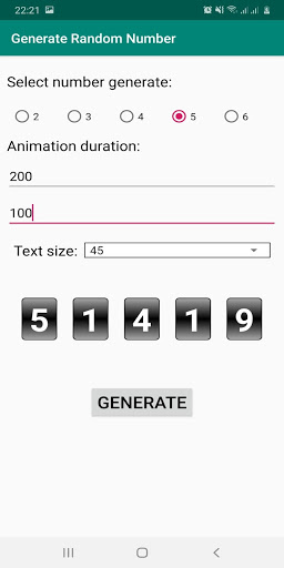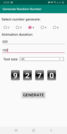Generate Random Number với hiệu ứng quay số đẹp mắt giúp tạo ra số ngẫu nhiên với số có nhiều chữ số khác nhau. Hãy cài đặt và cùng trải nghiệm tiện ích vô cùng thú vị.