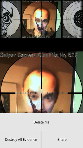 Snap a shot before they doSniper camera Gun is an augmented reality sniper first person shooter. Perfect for liveaction games like Humans vs. Zombies. Application shows real time view from device camera with an extra overlay of sniper scope aiming lines. Shoot with big red button. There is a 10bullet magazine which can be reloaded after bullets have been fired. Photo evidence is collected for every shoot and can be viewed in Tagrets Files section. The photo evidence can be shared in various ways like facebook picassa, email Gun features:sniper scope with aiming graphics zoom controlphoto evidenceshoot and reload.If you find error or have a suggestion, send an email please.