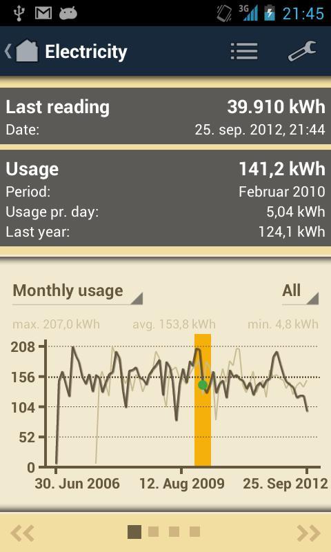 Based on the readings entered, it is possible to get a graphical overview of the monthly usage as well as statistics like total average and usage pr. day.