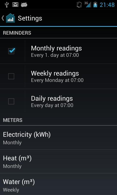 The app comes with 3 predefined meters (Electricity, Heat, Water), which can be altered or deleted as you see fit.