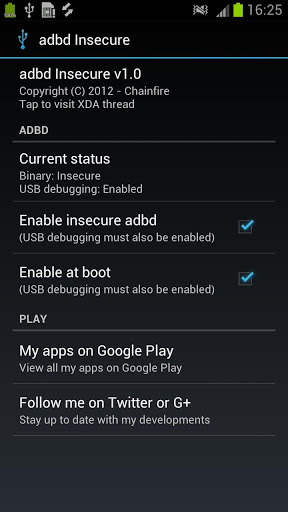 ถ้าคุณ กำลังใช้งานสต็อก (ผลิตโดยผู้ผลิตโทรศัพท์) เคอร์เนลบนอุปกรณ์ของคุณโอกาสที่ adbd กำลังทำงานในโหมด "ปลอดภัย" แม้ว่าคุณจะถูกรูท แอพนี้ให้คุณเรียกใช้ adbd ในโหมด "ไม่ปลอดภัย" ซึ่งช่วยให้คุณเข้าถึงรูทใน "adb shell" ช่วยให้สามารถเข้าถึงไฟล์ระบบและไดเรกทอรีผ่าน "adb push / pull" และให้คุณเรียกใช้คำสั่ง "adb remount" เพื่อให้ พาร์ติชันของคุณ / ระบบเขียนได้