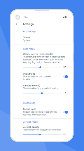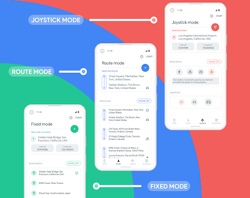 ● โหมดเส้นทาง (พรีเมี่ยม) : มันเปลี่ยนตำแหน่งของอุปกรณ์เป็นเส้นทางที่กำหนดไว้ล่วงหน้ามันสามารถจำลองการเดินปั่นจักรยานและการขับรถจากจุดเริ่มต้นไปยังปลายทางที่มีความเร็วและเส้นทางที่แตกต่างกันตามประเภททิศทางที่เลือกโหมดนี้สามารถใช้ในแอพตามเส้นทางหรือติดตามใด ๆ