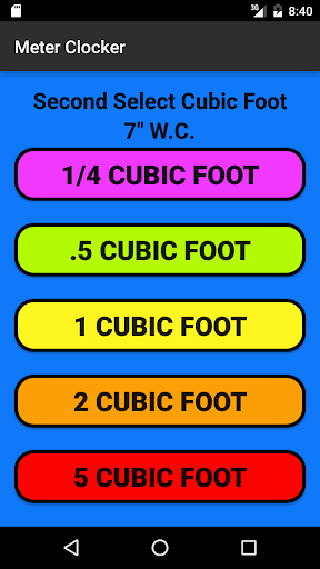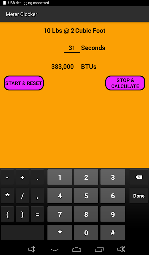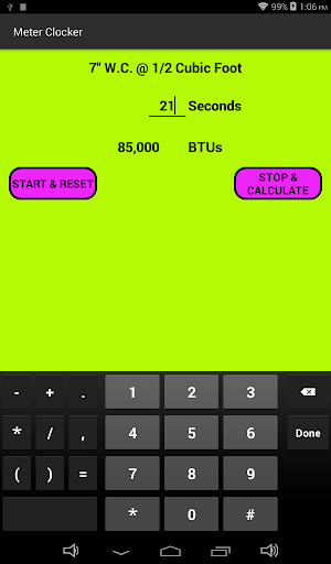 This app is design to calculate gas consumption on a meter. It can be used to check for inefficient appliances or total home or business consumption. It is design to work on pressure ranges: 7" water column, 2 psig, 5 psig, or 10 psig systems and meter index size 1/2 cu ft, 1 cu ft, 2 cu ft and 5 cu ft. Simply select your pressure then select your index measurement size and then enter the number of seconds to took to make 1 revolution then press calculate and it tell you how many BTU per hour are being consumed. You can now use this information to check against the rating plate on your appliance being tested to see if it under/over fired. Poorly running appliances can cost your hundreds of dollars and not to mention can be unsafe to operate.