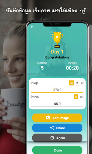 ติดตามความก้าวหน้าในการลดน้ำหนักได้ในรูปแบบกราฟ BMI ได้อย่างชัดเจน อีกทั้งคุณสามารถถ่ายภาพในแต่ละวัน เพื่อเป็นเปรียบเทียบหุ่นขิงคุณได้ด้วย ทั้งนี้ การออกกำลังกายจะเข้มข้นขึ้นทุกสัปดาห์ ดังนั้นอย่าลืมที่จะหยุดพักตามครอสที่เรากำหนดเพื่อให้ร่างกายปรับสภาพได้อย่างสมดุล