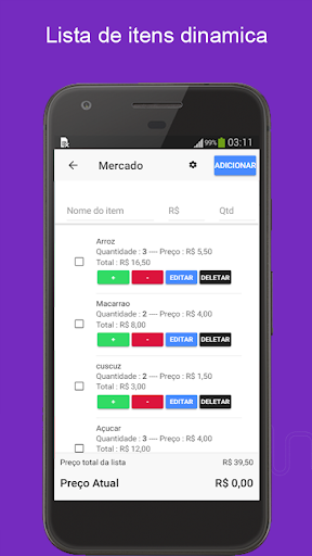 ด้วยรายการที่คุณสามารถสร้างรายการช้อปปิ้งซูเปอร์มาร์เก็ตในความสะดวกสบายของบ้านของคุณโดยไม่ต้องใช้กระดาษและปากกาหลังจากนั้นคุณสามารถแก้ไขรายการนี้ได้เช่นกันหรือลบรายการแล้ว ในตลาดคุณสามารถไปโดยใส่ราคาในรายการโดยการเพิ่มในรถเข็นดังนั้นคุณจะมีการควบคุมที่ดีกว่าว่าคุณใช้จ่ายมากแค่ไหน