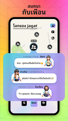 แชร์การอัปเดตแบบเรียลไทม์กับเพื่อนของคุณและดูว่าพวกเขากำลังทำอะไรบน JAGAT ยิ่งไปกว่านั้น คุณยังสามารถสร้างแผนที่โลกใบใหม่ของคุณได้! สามารถใช้ข้อความโต้ตอบแบบทันทีและวิดีโอแชทเพื่อติดต่อกับเพื่อน และสร้างคอมมูนิตี้ของคุณเองได้!