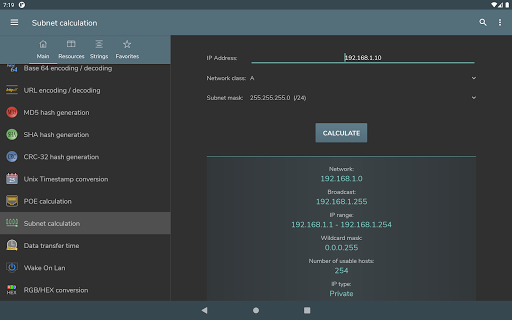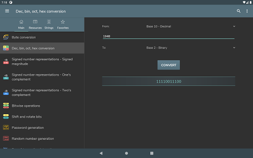 Byte Conversion - ธ.ค. , ถังขยะ, ต.ค. , hex แปลง - การแสดงหมายเลขที่ลงนาม: ขนาดที่ลงชื่อ, ส่วนประกอบของหนึ่ง, การดำเนินการของทั้งสอง - การดำเนินการบิต และหมุนบิต - การสร้างรหัสผ่าน - การสร้างหมายเลขแบบสุ่ม - การเข้ารหัส / การเข้ารหัส / การเข้ารหัส / การเข้ารหัส URL / การถอดรหัส - MD5, SHA, CRC-32 Hash Generation - การแปลง Timestamp UNIX การแปลง RGB / Hex