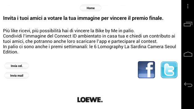 Non solo. Invita i tuoi amici a votare la tua immagine su myloeweconnect.com oppure sull’app scaricata sul proprio iPhone. La foto che riceverà più like verrà premiata con una Bike by Me, l’esclusiva bicicletta di design da personalizzare in tutti i suoi dettagli.
