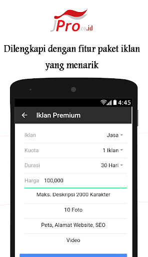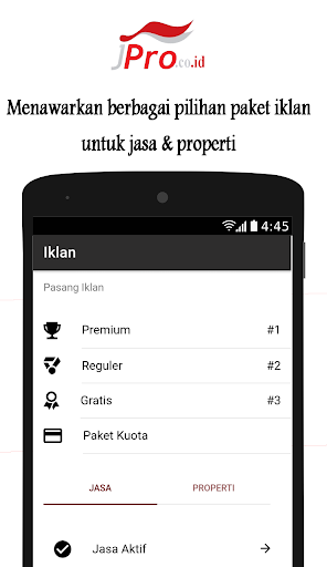 JPro adalah aplikasi yang memberikan layanan jasa pengiklanan usaha dan profesi secara online yang ditawarkan kepada pelanggan yang berlokasi diseluruh Indonesia. Tujuan layanan iklan pada pada JPro adalah mempermudah para pelaku usaha dan profesi untuk memperkenalkan usahanya secara luas dengan mengiklankan secara aktif dan terus menerus agar para pelanggan mengetahui jasa yang ditawarkan atau tempat usahanya yang akhirnya meningkatkan pendapatan usaha.