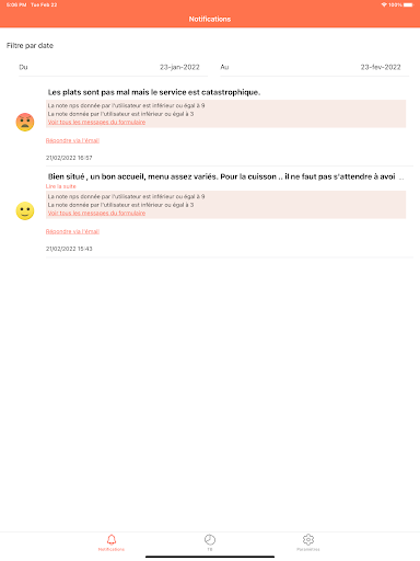 L'application permet aux managers feedback.ma de gérer les retours clients: commentaires, évaluations, notifications instantanées suivant leurs critères.