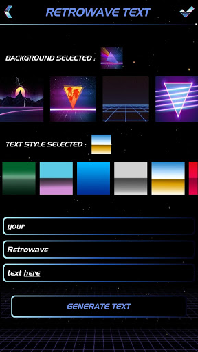 - แอป Retrowave Text: Retrogram App ให้คุณสมบัติที่เรียกว่า Retrowave Text Maker ให้คุณสร้างข้อความ Retrowave Meme ของคุณด้วยการปรับแต่งแบบเต็ม เป็นการเปลี่ยนขนาดตัวอักษรสีข้อความและแบบอักษรข้อความและเมื่อคุณทำเสร็จคุณสามารถบันทึกข้อความ retrowave สุดท้ายของคุณลงในแกลเลอรี่ของคุณ