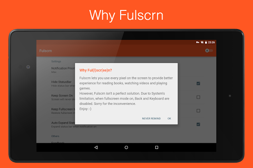 อย่างไรก็ตาม Fulscrn ไม่ใช่โซลูชั่นที่สมบูรณ์แบบเนื่องจากข้อ จำกัด ของระบบเมื่อโหมดเต็มหน้าจอด้านหลังและแป้นพิมพ์ถูกปิดใช้งานขออภัยในความไม่สะดวก
