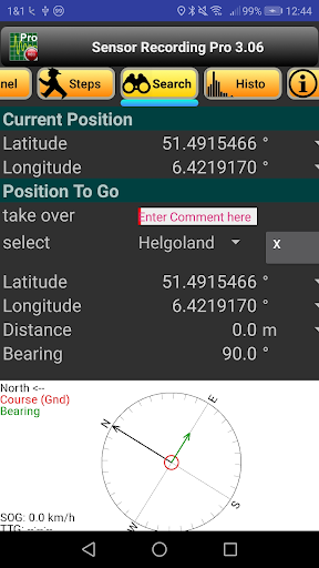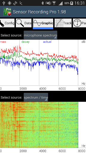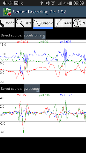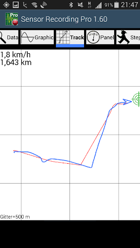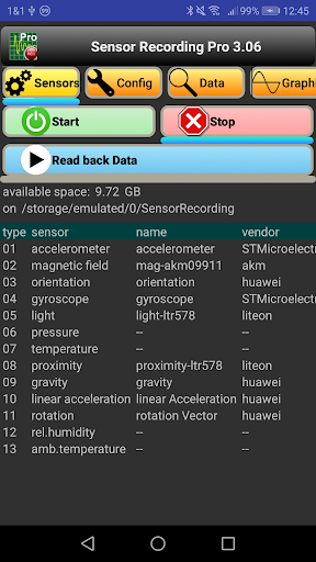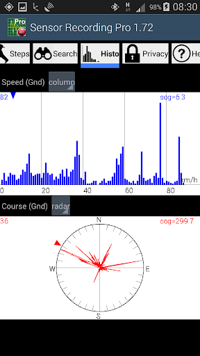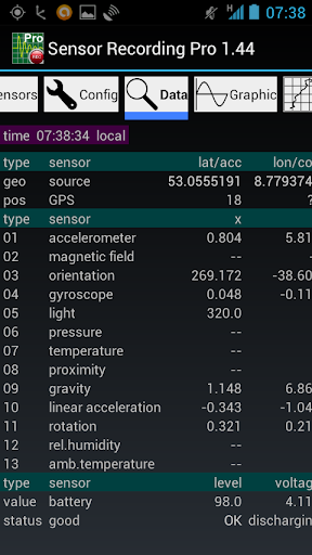 นอกจากนี้ยังสามารถอ่านการวัดทั้งหมดค่าแสดงในรูปแบบตารางหรือกราฟิกและจัดเก็บไว้เป็นไฟล์ ASCII (CSV = ค่าที่คั่นด้วยเครื่องหมายจุลภาค) เพื่อการประเมินเพิ่มเติมที่เป็นไปได้เช่นในแผ่นสเปรดเช่น MS Excelนั่นคือจุดสนใจหลักของแอพนี้ตามชื่อของมันนอกจากนี้ข้อมูลตำแหน่งจะถูกบันทึกไว้ในไฟล์ KML สำหรับการแสดงโดยตรงด้วยโปรแกรมเช่น Google Earthไฟล์ที่เกี่ยวข้องทั้งหมดอยู่ในไดเรกทอรีย่อย & quot; sensorrecording & quot;.