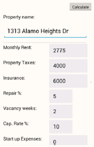 The app allows you to perform calculations on one of the following three parameters: monthly income; Cap Rate ; and Offer Price of the property to the depositor when
