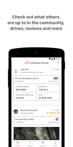 Your user profile will be updated with your own driving experiences and the activity stream is populated with comments and reviews on roads you have added to your favourites.