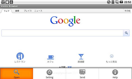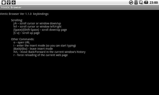 Vimtick browser is a android browser with strong inspiration from the Vimperator.I recommend using physical keyboard to use this application.You can customize key assigning by setting. Ver 1.2keybindings:Scrolling:1: j – scroll cursor or window down2: k – scroll cursor or window up3: h – scroll cursor or window left4: l – scroll cursor or window right5: [Space] – scroll down page6: [Shift-Space] – scroll up pageOther Commands:7: o - open URL8: i - enter the insert mode (so you can start typing 9: [Menu] - leave insert mode10: H - move Back in the current window's history11: L - move Forward in the current window's history12: r - force reloading of the current web page13: g - enter the go mode14: gh - go home. Opens the homepage15: gg - go to the top of the document16: G - go to the bottom of the document