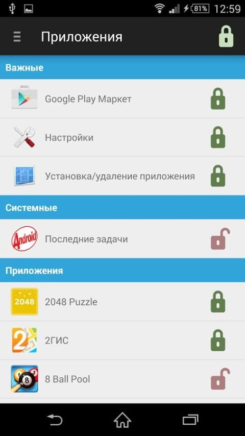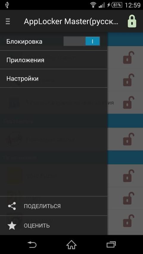 • Блокировка запуска любого приложения паролем или графическим ключом