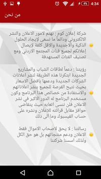 يتيح لك تطبيق اعلان كم العديد من العروض والاعلانات وبالاضافة الى ذلك في حال قمت بمشاركة الاعلان والاعجاب به ستحصل على مجموعة كبيرة من النقاط حيث كل نقطة تتمثل بقرش واحد تقوم باستبدالها بنقود عند بلوغها 500 نقطة او اكثر اي ما يعادل 5 دنانير اردنية