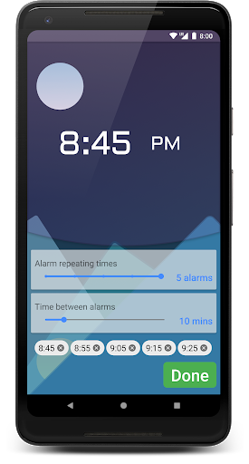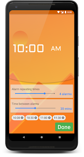 You just need to select the time, number of alarms and time between every alarm and the app will set them for with a single click