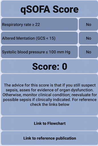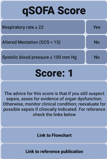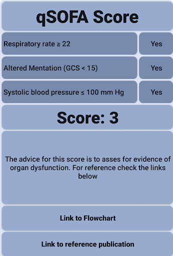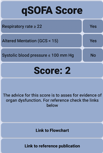 เครื่องมือที่ง่ายและรวดเร็วในการกำหนดคะแนน QSOFA ของผู้ป่วยของคุณรวมอยู่ในการเชื่อมโยงไปยังสิ่งพิมพ์ดั้งเดิมและลิงก์ไปยังผังงานในสิ่งพิมพ์นั้นนักพัฒนาซอฟต์แวร์นี้ไม่ได้มีส่วนเกี่ยวข้องกับองค์กรที่สร้างคะแนนดังนั้นแอปจึงมีปุ่มเชื่อมโยงไปยังสิ่งพิมพ์ต้นฉบับสำหรับฉันเครื่องมือเล็ก ๆ นี้สะดวกสบายเป็นเครื่องเตือนความจำและวิธีที่รวดเร็วในการประเมินผู้ป่วยของฉันด้วยการติดเชื้อที่สงสัย
