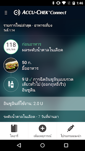 แอป Accu-Chek Connect ใส่เครื่องมือการจัดการเบาหวานไว้ในฝ่ามือของคุณ คุณลักษณะต่าง ๆ ของแอปจะรวมถึง: