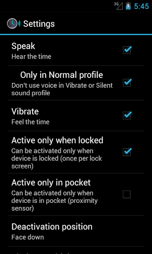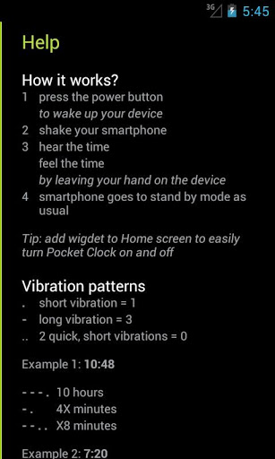Do you want to know what time it is even without putting your smartphone out of pocket? Pocket Clock announces actual time using voice and / or vibrations which is useful especially in noisy locations or when you want to know current time discretely.