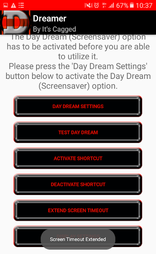 Most Android devices have dream mode screensaver available.The problem is, you can only activate it when your phone is docked or on charge. This small free application will run your phones dream screensaver mode without charging or docking your device.