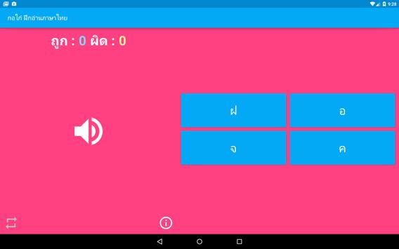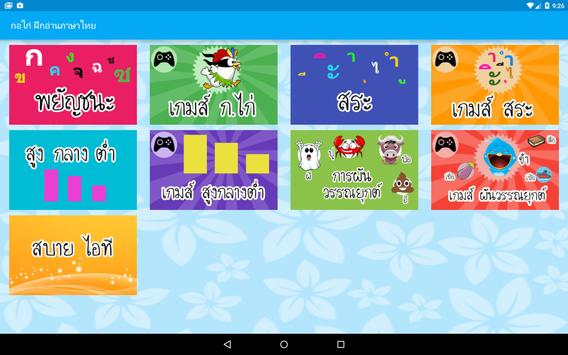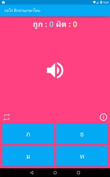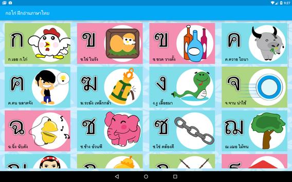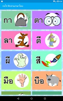 สื่อการเรียนการสอน สำหรับเด็ก พัฒนาการเด็ก ภาษาไทย ฝึกอ่านออกเสียงพยัญชนะ ก.ไก่ - ฮ.นกฮุก (Thai Alphabet), สระไทย และการผันวรรณยุกต์ไทย โดยมีภาพประกอบพร้อม เสียงสำหรับฝึกอ่านภาษาไทย ด้วยภาพและเสียงทำให้ง่ายและสะดวกต่อการใช้งาน เพียงแค่กดไปที่รูปภาพแต่ละรูปจะมีเสียงเพื่อฝึกอ่านออกเสียงตามได้ เหมาะสำหรับเด็กที่อาจจะยังอ่านหนังสือไม่ออกก็สามารถฝึกและได้รับความเพลิดเพลินได้
