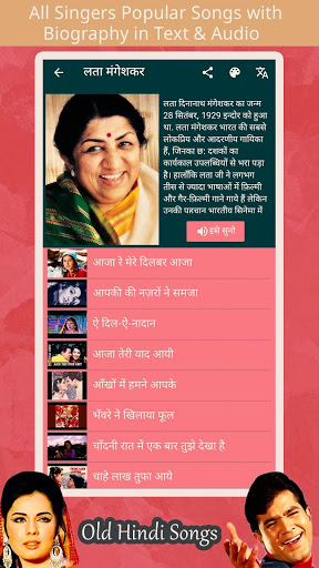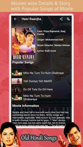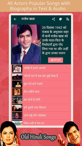 Along with Old Songs Audio, the app gives you various other features like Singer Biography, Actors Biography, and Movies Details.