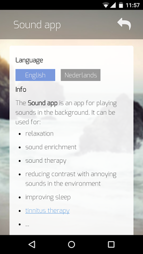 การใช้แอพ Sound App นั้นง่ายมาก: เพียงแค่ เลือกเสียงและมันจะเล่นอย่างต่อเนื่องในพื้นหลัง คุณสามารถใช้อุปกรณ์ของคุณต่อไปในขณะที่เสียงกำลังเล่นอยู่ เสียงยังคงเล่นต่อเมื่อปิดหน้าจอ