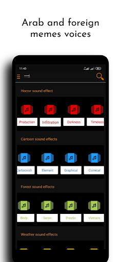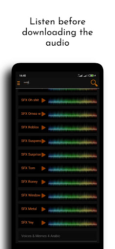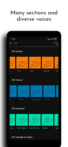 เมื่อคุณดาวน์โหลดแอปพลิเคชันคุณจะได้รับไลบรารีที่เต็มไปด้วยเอฟเฟกต์เสียงในรูปแบบ MP3 ส่วนและในแต่ละส่วนเสียงจำนวนมากและยังมีแถบค้นหาสำหรับไฟล์เสียงใด ๆ