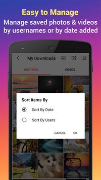 🔸 Sort downloaded photos and videos with username and date using this apps inbuilt gallery.
